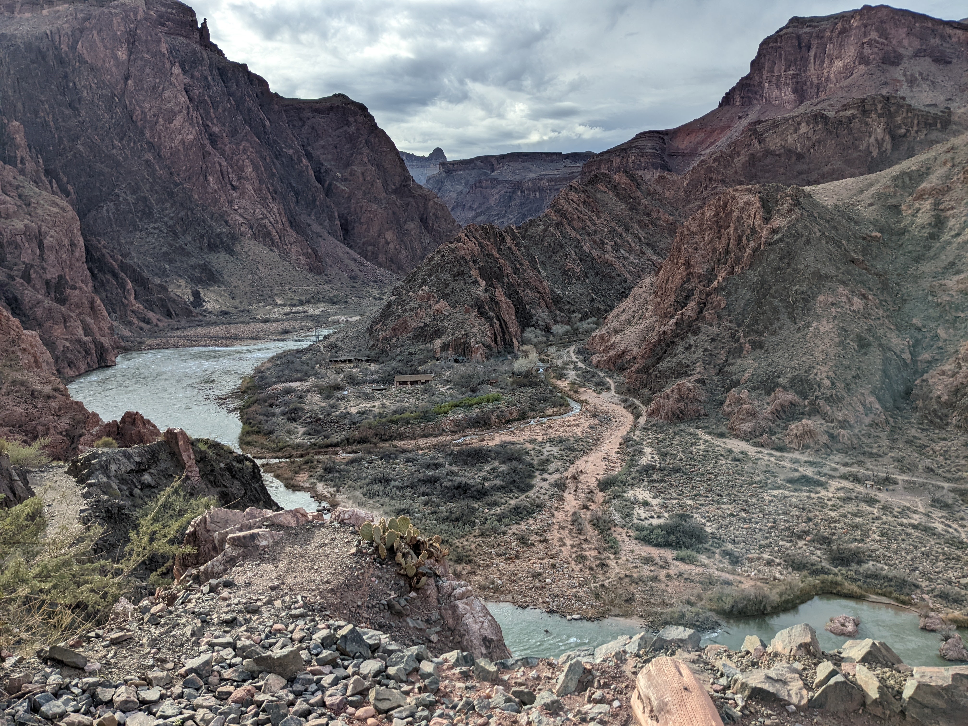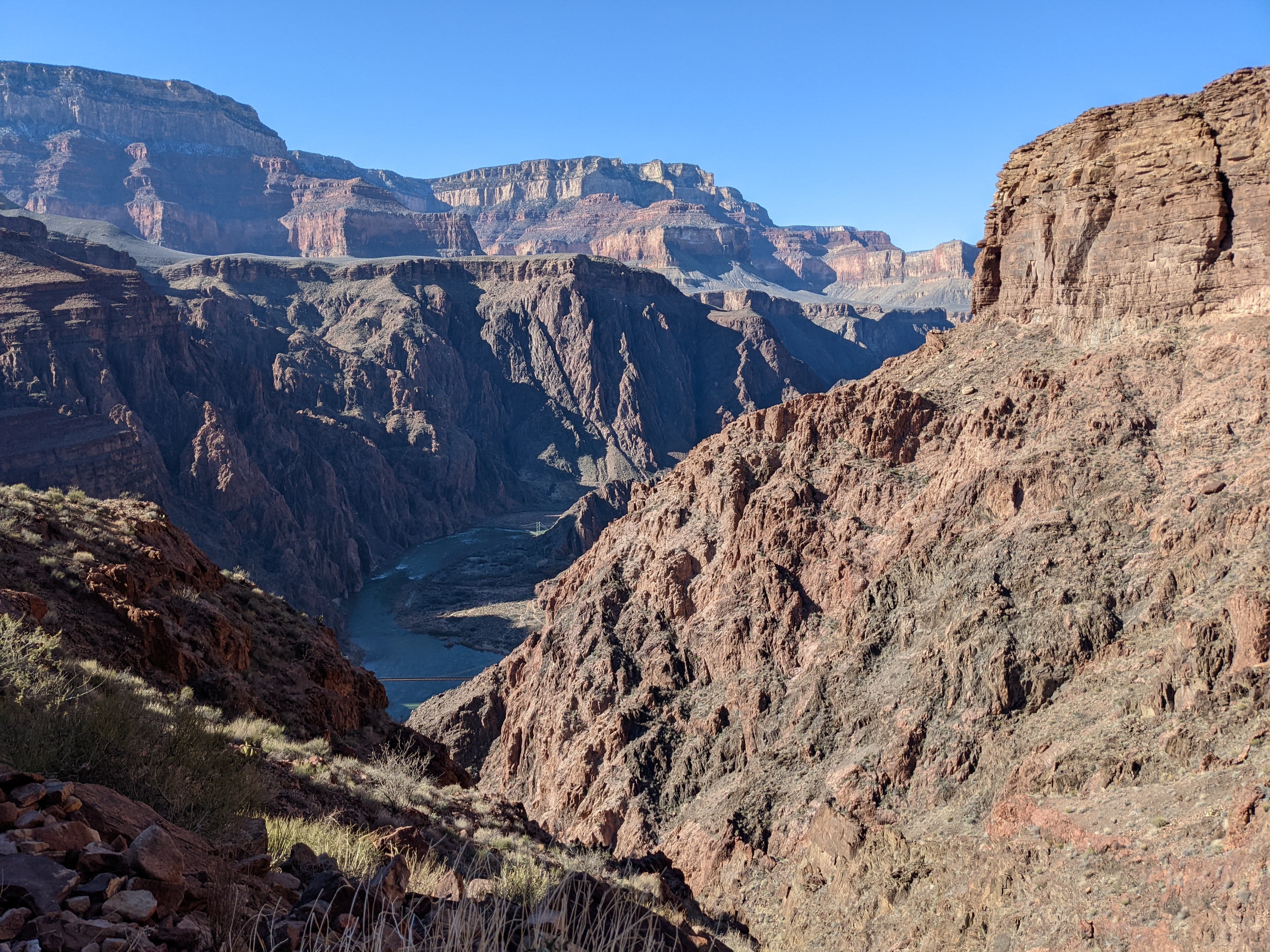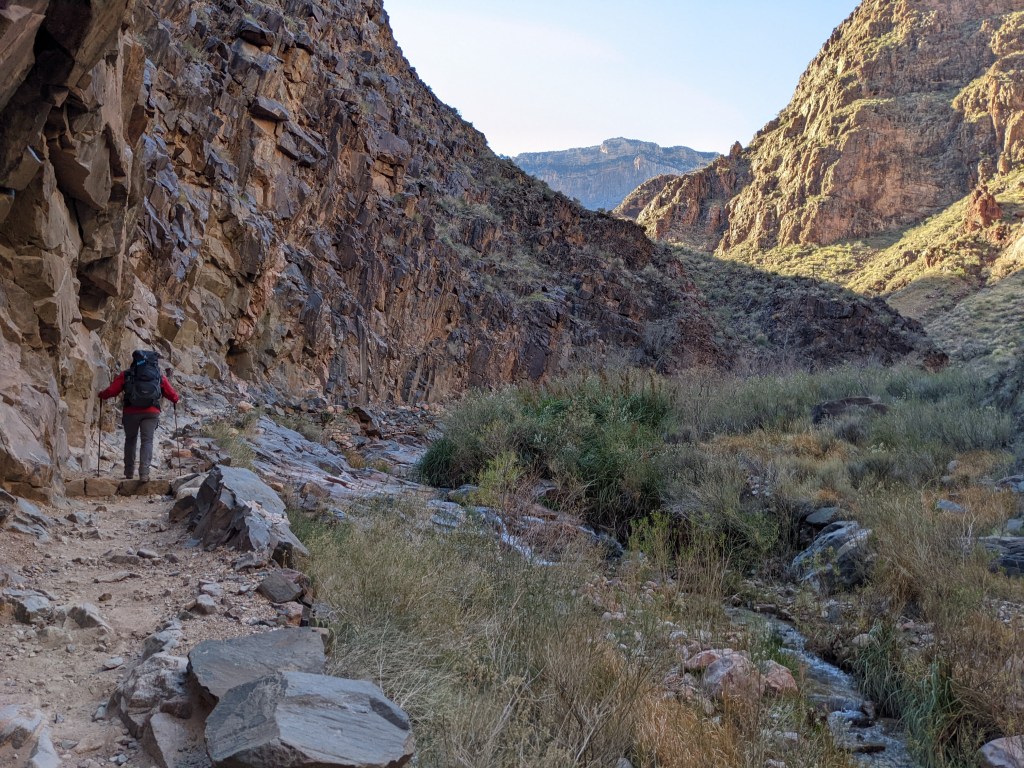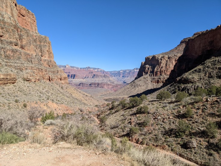 The hike down was spectacular, another incredible view around every corner. Since we got a late start, there were very few people hiking in the same direction so it felt much more remote than I was expecting. We did pass quite a few day hikers on their way back up, but after a couple of miles, that thinned out considerably. We ended up making it down to Bright Angel Campground in less than 3 hours. The campground is situated at the junction of Bright Angel Creek and the Colorado River and the descent into the campground is really a beautiful sight.