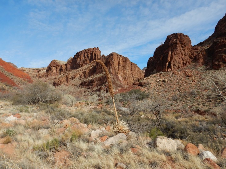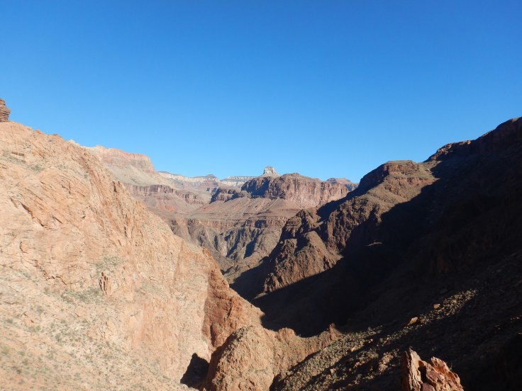 With an early start the next morning we made our way to the start of the Clear Creek Trail, about three-tenths of a mile past Bright Angel Campground. We took this trail East along a ridge that roughly follows the Colorado River along the Tonto Platform. After an initial steep hike up, the rest of the hike had very little elevation gain/loss and we were met with spectacular views of the river into the canyon. The hike was fully in the sun – there was zero shade from start to finish and no water sources along the way. While we we welcomed the warmth and it made for perfect hiking weather in February, it would have been a dangerous trek in the summer.