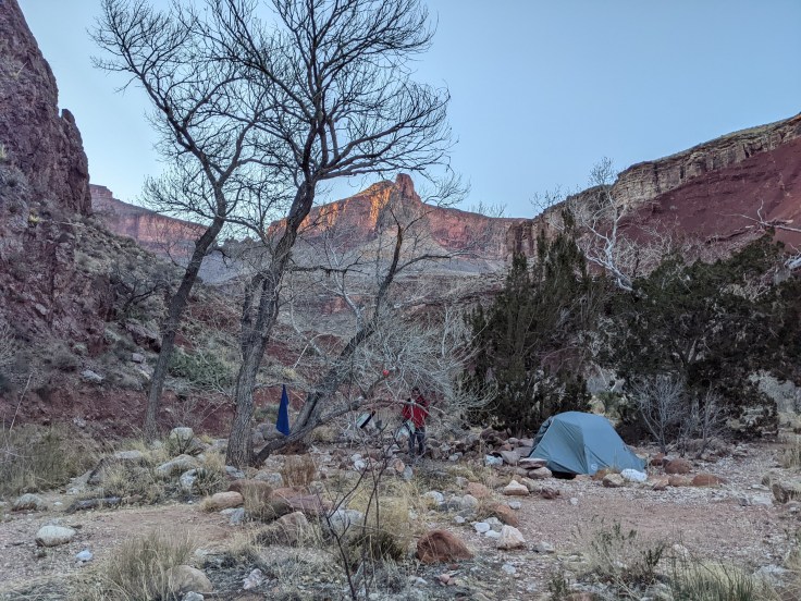 We got situated at our site, emptied all of our “smelly” belongings (food, toothpaste, etc.) into the provided food box at our site, and hung our bags on the provided poles. They suggest that you completely empty your backpack and hang it with all of the zippers open to avoid critters chewing through it. I did exactly that – I didn’t want to take any chances! After scarfing a ramen and beef jerky dinner, we were ready to crash. It got dark very early, and once the sun set the temperature dropped quickly. They don’t allow campfires in the canyon, so we found ourselves in our tent by around 7pm every night! The nights were cold, but not unbearable – I believe the low was right around freezing, just about as cold as our equipment could take.