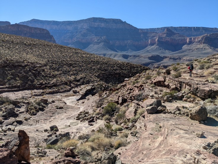 We saw only one hiker on our way to Clear Creek and he was heading in the other direction. The seclusion made the hike feel almost surreal. As the trail meandered across Tonto platform, we were met with views of the sandstone tapeats, as well as several washes and drainage areas. Before we left the campsite that morning, the host warned us that when we felt like we were almost there that meant we were about halfway. We understood his warning as the winding path was deceptively longer than it looked to the naked eye.