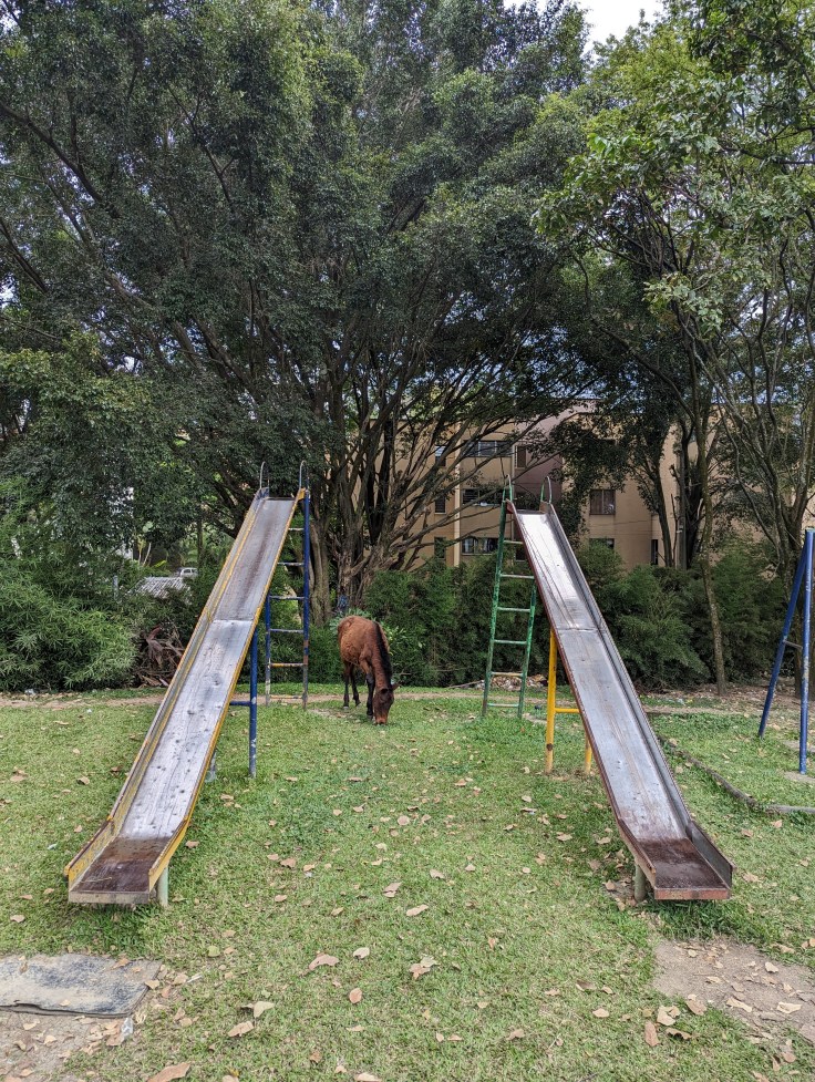 On the walk back to the metro station, we stumbled upon a lonely donkey grazing in a playground.