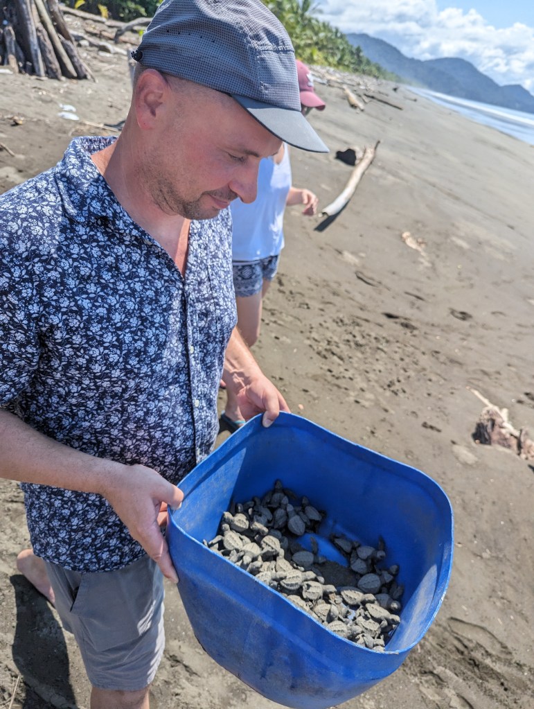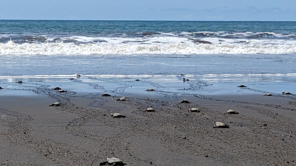 When the turtles hatch, they all hatch at the same time and communicate to each other through sounds that it’s time to get out of the sand and make their way to the ocean. That is where we had the opportunity to be a part of the process and set these baby turtles free! We went out with our bucket of baby turtles and set them off, one-by-one. They knew exactly what to do, straight to the ocean! It was one of the cutest and most incredible things I’ve ever seen, I almost cried. They just seemed so small to be entering the massive sea already! We watched them as they scurried towards the water and got swept up and tumbled through the waves. They all seemed so excited! These tiny turtles would grow to become 3-4 feet across and live to be 150 years old. Amazing.