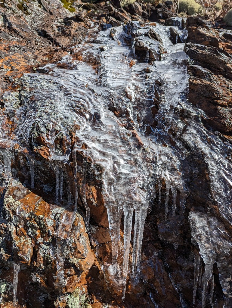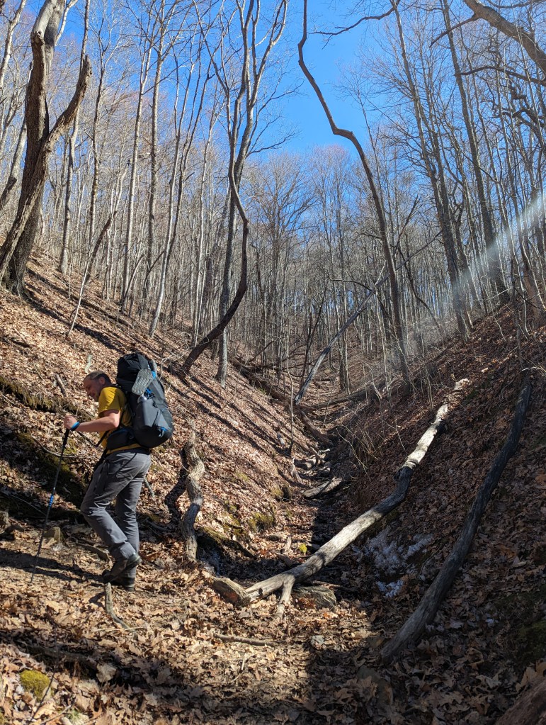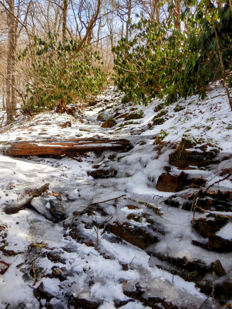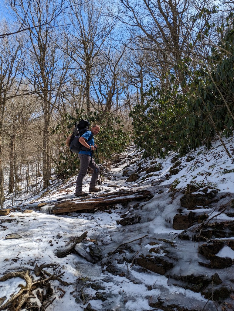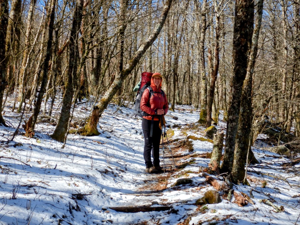 The second day was another hike of walking in the sun around snowy, icy trails. This section was definitely a lot more challenging than the day before. The climbs were steeper, the trail was more treacherous (icy and muddy), and consecutive 15 mile days still take it out of us! I was totally beat after this day. We were going to try to push for 17 miles, but it was slow going and we just could not hike any further. The temps were dropping quickly and there was a harsh wind blowing up the mountain, so we set up camp at the nearest shelter and hunkered down for the night.