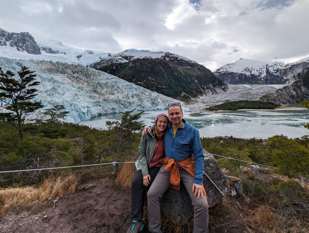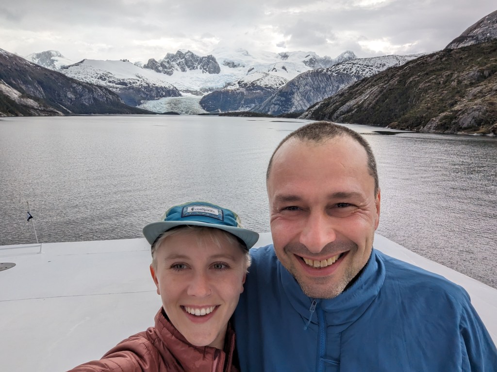 The plan over the next few days was to cruise through the channels and disembark at certain landmarks for short hikes. Our first disembarkation was to be Cape Horn, the southernmost point in the world. They warned us that the waters and weather around Cape Horn can be rough and unpredictable, so the excursion was weather permitting. As we arrived at the destination, we were in our room when we received the announcement that the weather would not allow us to disembark but we were welcome outside on the deck for a better view. A bit disappointed, I made my way to the deck with a coffee in hand. When I walked outside, I was literally almost knocked over by the force of the wind and I spilled my coffee everywhere – they were the most intense winds I have ever experienced! Alex and I made our way to the upper deck and essentially played in the wind for an hour, leaning into it and letting it knock us around. My disappointment quickly turned into glee, it was so cool to experience such intense weather at Cape Horn! We were told later that the wind was at 70 knots, about 80 mph.